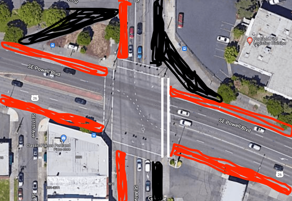 Currently at Powell/Milwaukie, there are five lanes to cross at each leg, with wider lanes on Powell. In addition, there are high-speed slip lanes between Milwaukie and Powell on the north side. Slip lanes really (and I mean really) suck to cross as a pedestrian – since drivers really do not expect you to be there, and often they have no signage or incentive to yield. Oh and there is a closed crosswalk on the east side of the intersection, no doubt to “improve vehicle flow” and “reduce conflicts”.
