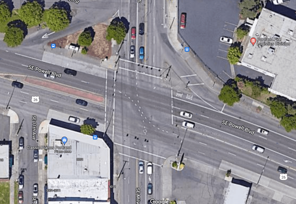 Removing the slip lanes, and converting the outermost lane on Powell to dedicated bus-only would be a good place to start here. In addition, re-adding the crosswalk on the east leg of the intersection is sorely needed (especially for a transit rider hoping to transfer from the 9 eastbound to the 70 northbound). I would also like to see the south end at Milwaukie significantly narrowed – probably to one bus/bike lane and one car lane southbound, and removing one of the northbound lanes altogether. And simply extending curbs to be flush with the road (eliminating curves that allow for wider turns from cars) would do a lot to make the intersection feel safer – reducing the speed of turning cars really makes a difference.