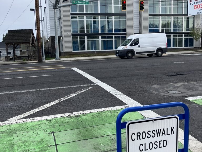 And so I’d ask why on earth we’ve gotten things like this – a crosswalk closed sign on Division and 159th. This is new enough that it’s not even available to see on Google Street View! And it’s at a fully signalized crossing that was built for the Division Transit Project – which had a bottom line in the hundreds of millions. Yet, the only complaint that registered to our city leaders came to allow more automotive access to the Roman Russian Market on 102nd.