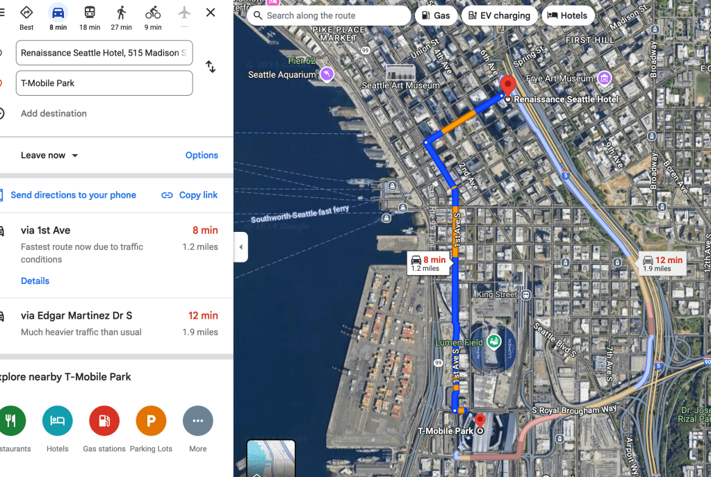 Or you could hop on the Link for a good portion of the walk – even if the stadium station location is less than ideal. It would might even be on par with rush hour travel times. As a brief aside – Google does not show the pedestrian path connecting the Stadium Light Rail stop to the Stadiums! So the actual transit travel time is likely to be slightly shorter than shown here. I reckon I could do it about 15 minutes.