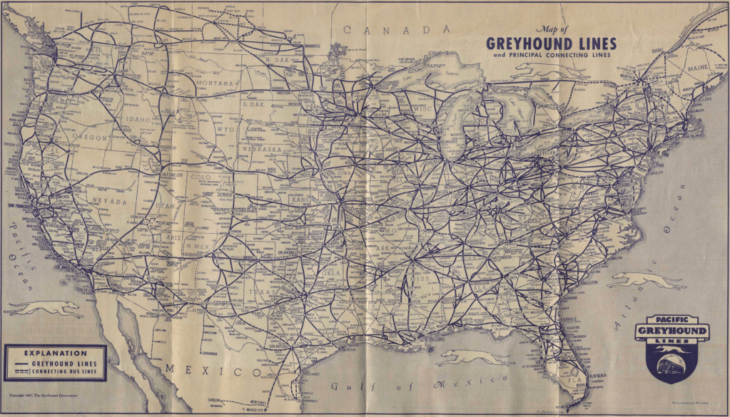 In the 1940s, the map routes served by Greyhound basically looked like the map of federal highways. Anywhere that the roads went, you could count on finding a Greyhound. And not just once a day.