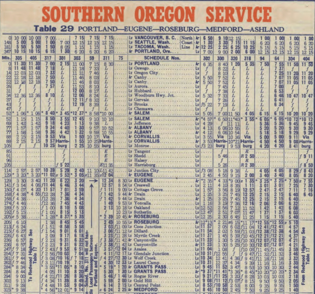 In 1937, the route that would become I5 in 20 years hosted eight round trips between Medford and Portland. And they managed this at a time when Southern Pacific still ran passenger trains on the Siskiyou line (though just two round trips per day – page 830), while also not being the sole intercity bus carrier on the route. So travelers had their pick of when to leave, and missing a bus or train was only a problem in that you probably had to buy another ticket.
