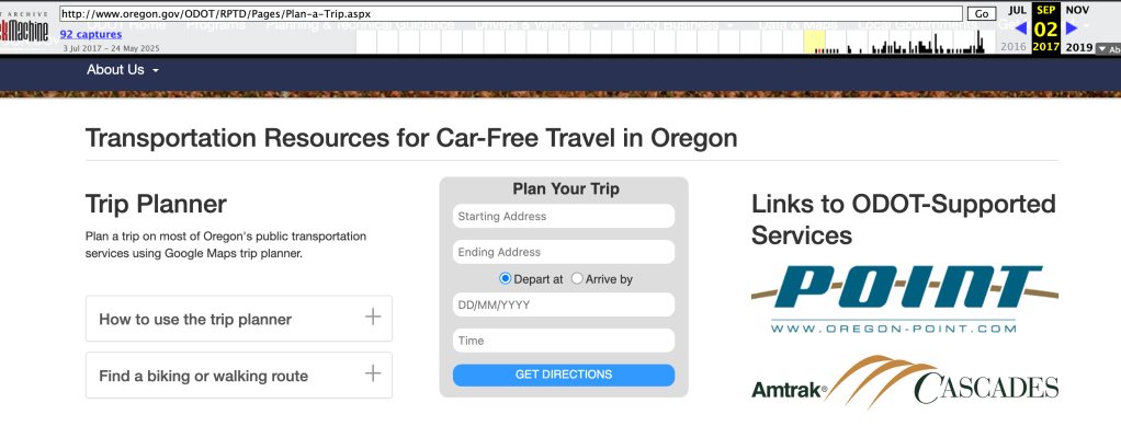 Of course, lacking a unified state-wide system of fare payment and scheduling makes a state agencies ability to comment on how to ride the bus limited, but the variation isn’t that big between regions, and the information provided by ODOT on their website is not generally reliable. As an example: the “plan a car-free trip”3 page’s description of “How to use the trip planner” has not been updated since the system was overhauled to use the “Get There” trip planning option over Google Maps.