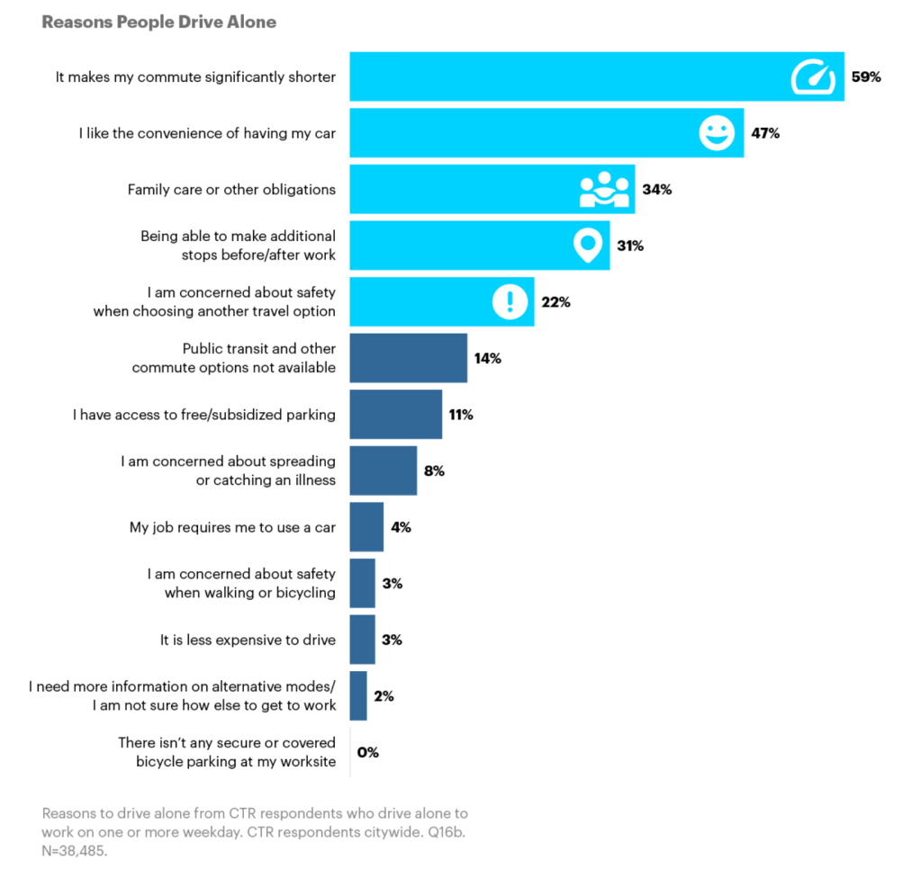 Looking at Seattle in 2024, Commute Seattle found that 59% of downtown Seattle workers who drove chose to do so for time saving reasons – while 47% mentioned convenience and 34% mentioned other obligations that require a car. Having public transportation from home to work be faster would cover some people, but not all12. In reality, the pervasiveness of car culture means that people have regular social obligations 20 miles away from home and have no real choice but to drive or not participate.